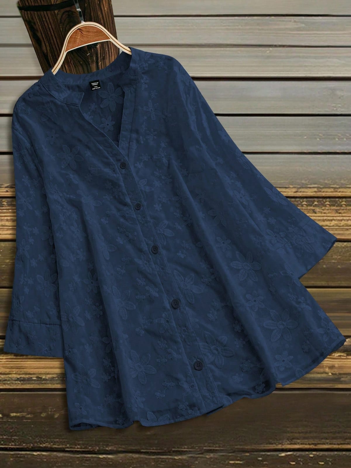 This Women’s Embroidered Navy Blue Top features intricate floral embroidery and a relaxed button-down design. Made from soft fabric, it offers both comfort and elegance, making it perfect for casual outings or semi-formal events.