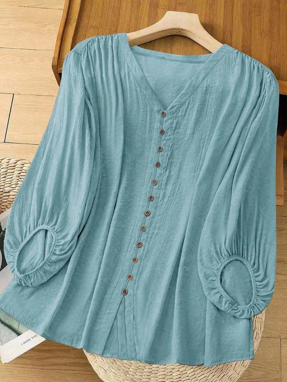 This Women’s Sky Blue Top features a stylish V-neck design with button-down detailing and relaxed, voluminous sleeves. Made from soft, breathable fabric, it offers a comfortable, chic look that is perfect for casual outings or everyday wear.